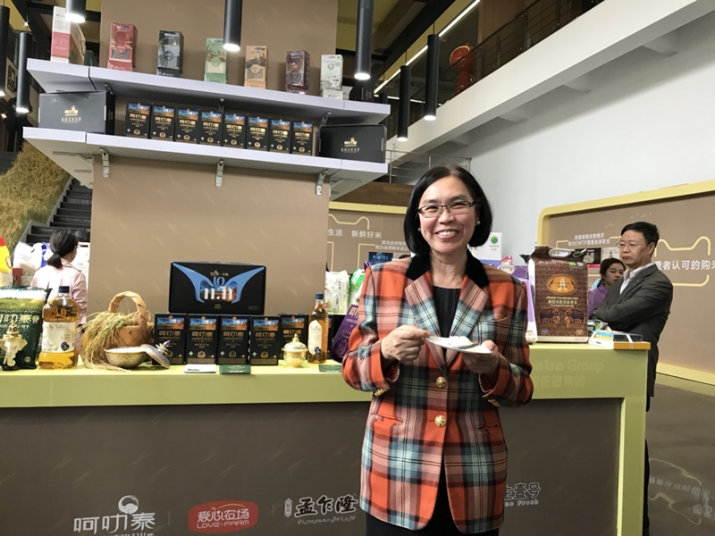 “ดิฉันรู้สึกเป็นเกียรติอย่างยิ่งที่ได้เป็นส่วนหนึ่งของงานวันนี้และมีความยินดีที่ผู้บริโภคชาวจีนชอบข้าวไทยและสั่งซื้อข้าวไทยผ่านทางออนไลน์ นอกจากข้าวหอมมะลิและผลิตภัณฑ์ข้าวอื่นๆ ที่ กระทรวงพาณิชย์ กำลังทำงานร่วมกับอาลีบาบาในการทำตลาดผ่านทาง Thai Rice Flagship Store ภายใต้ ทีมอลล์ เรายังอยากแนะนำข้าวพันธุ์อื่นให้กับผู้บริโภคชาวจีน เช่น พันธุ์ กข43 ซึ่งถือเป็นข้าวพันธุ์พิเศษที่มีผลดีต่อสุขภาพ ซึ่งจากการศึกษาวิจัยพบว่า มีค่าการแตกตัวเป็นน้ำตาลน้อย และมีค่าดัชนีน้ำตาล (ค่า GI) อยู่ปานกลางค่อนข้างต่ำ ถือเป็นข้าวทางเลือกของผู้ใส่ใจสุขภาพ เหมาะกับผู้บริโภคชาวจีนรุ่นใหม่ที่มีกำลังซื้อสูง และให้ความสนใจกับการรักษาสุขภาพและความกินดีอยู่ดี”