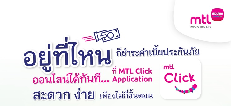 นอกจากนี้ ยังยกระดับการให้บริการในรูปแบบการชำระค่าเบี้ยประกัน ภัยออนไลน์ ผ่าน MTL Click Application เพื่อให้ชีวิตเป็นเรื่องง่าย แม้ไม่สะดวกออกไปไหนก็ไม่ต้องกังวล เพียง Login เข้าใช้งานแอป MTL Click เลือกเมนู การชำระเบี้ย ทำตามขั้นตอนที่ปรากฏ และเลือกช่องทางการชำระเงินที่คุณสะดวก อาทิ K Plus Application บัตรเครดิต หรือบัตรเดบิตธนาคารกสิกรไทย ก็สามารถทำธุรกรรมกับบริษัทฯ ได้ทุกที่ โดยลูกค้าสามารถชำระเบี้ยประกันภัยได้สูงสุด 1,000,000 บาท/กรมธรรม์ กรณีชำระเบี้ยประกันภัยผ่านบัตรเครดิต ทั้งนี้ เงื่อนไขเป็นไปตามที่บริษัทฯ กำหนด ดูรายละเอียดเพิ่มเติมได้ที่ www.muangthai.co.th
