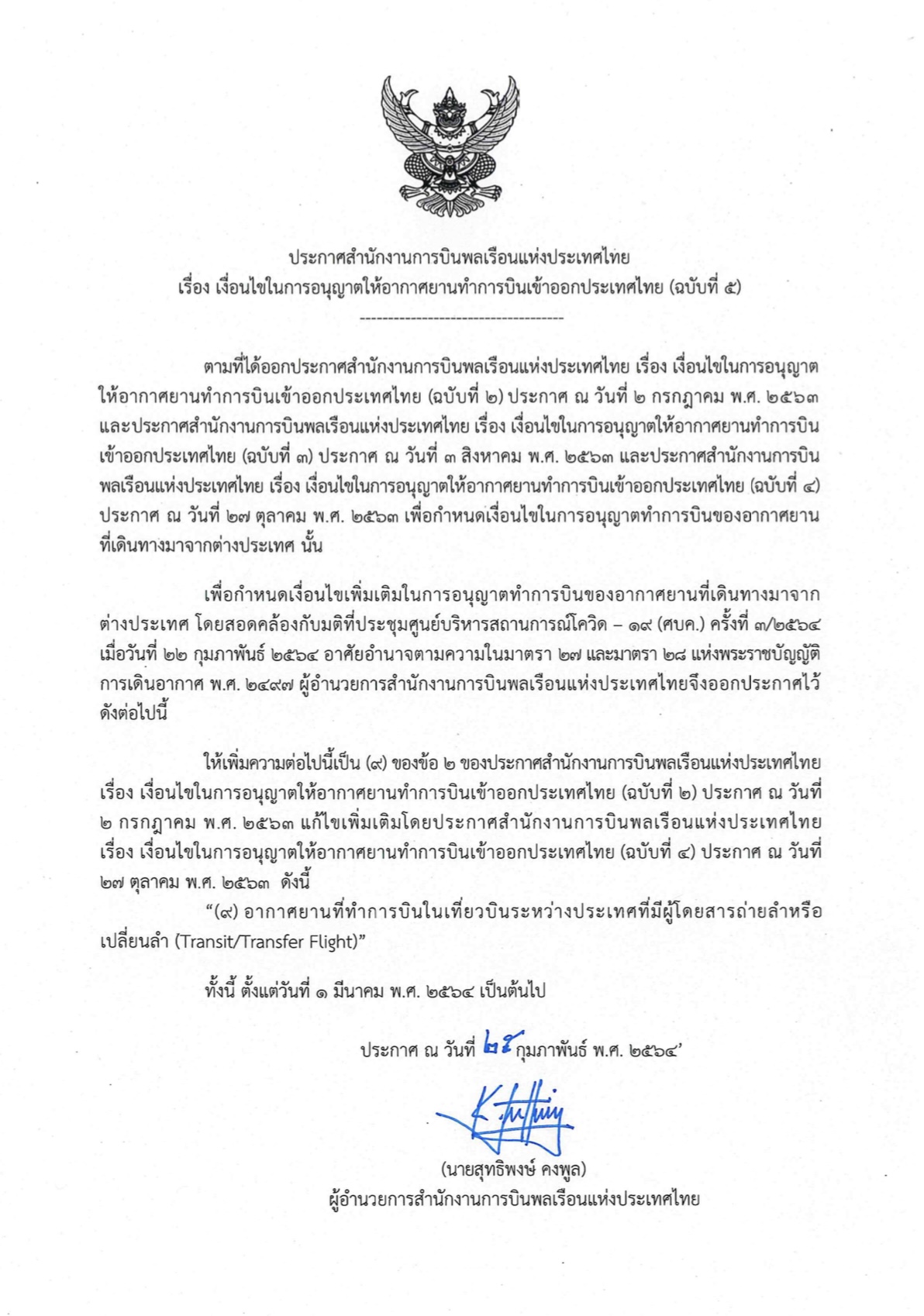 ทั้งนี้ เพื่อกำหนดเงื่อนไขเพิ่มเติมในการอนุญาตทำการบินของอากาศยานที่เดินทางมาจากต่างประเทศ โดยสอดคล้องกับมติที่ประชุมศูนย์บริหารสถานการณ์โควิด-19 (ศบค.) ครั้งที่ 3/2564 เมื่อวันที่ 22 ก.พ. 2564 อาศัยอำนาจตามความในมาตรา 27 และมาตรา 28 แห่งพระราชบัญญัติการเดินอากาศ พ.ศ. 2497 ผู้อำนวยการ กพท. จึงออกประกาศเพิ่มความเป็น “อากาศยานที่ทำการบินในเที่ยวบินระหว่างประเทศที่มีผู้โดยสารถ่ายลำหรือเปลี่ยนลำ(Transit/Transfer Flight)” (9) ของข้อ 2 ในประกาศสำนักงานการบินพลเรือนแห่งประเทศไทย ในฉบับที่ 2, 3, 4 ดังกล่าวข้างต้น โดยมีผลบังคับใช้ตั้งแต่วันที่ 1 มี.ค. 2564 เป็นต้นไป