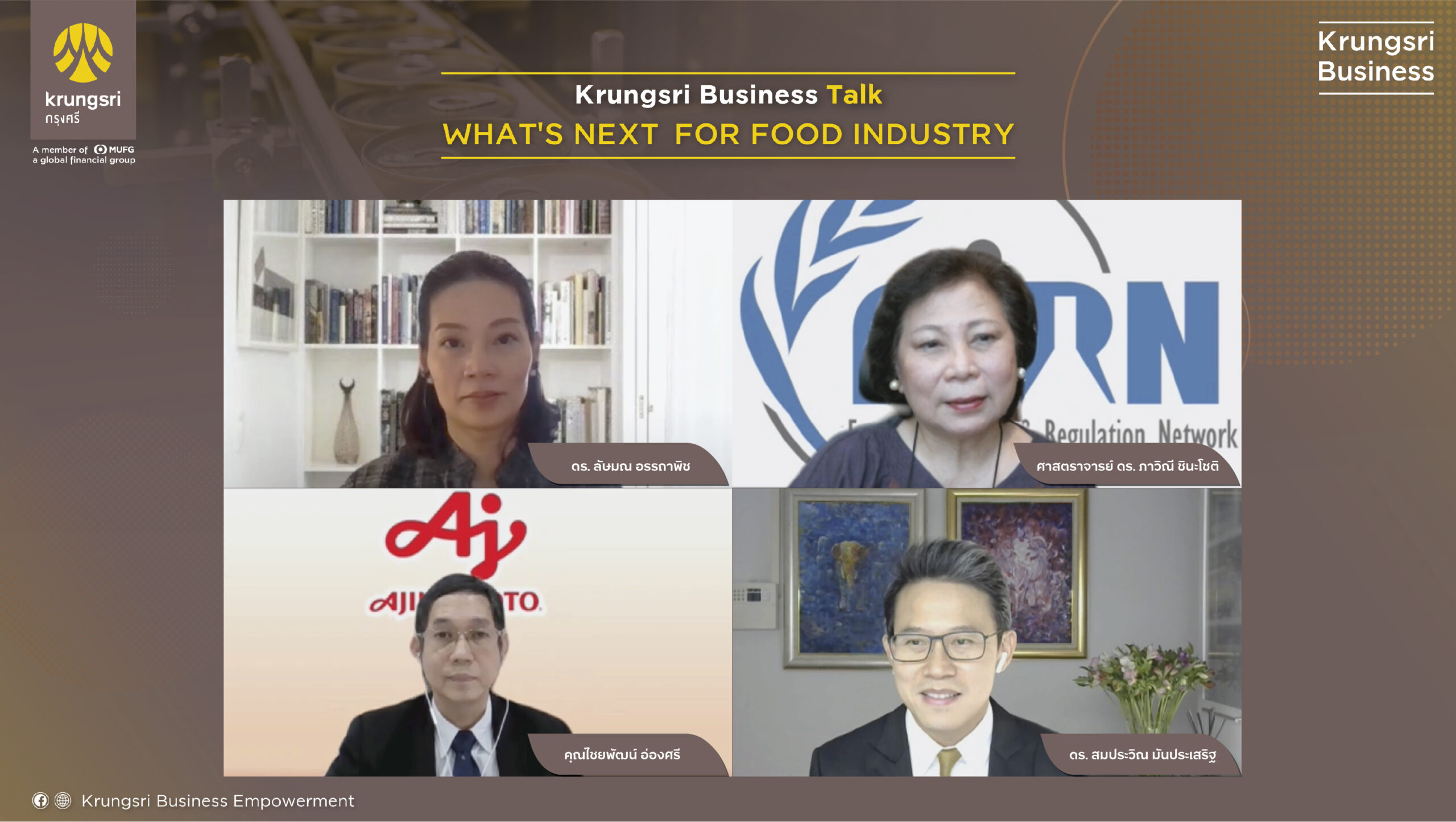 (ธนาคารกรุงศรีอยุธยา จำกัด (มหาชน)) เสริมสร้างศักยภาพด้านธุรกิจแก่ลูกค้าธุรกิจเพื่อการเติบโตอย่างยั่งยืนผ่านกิจกรรมสัมมนาออนไลน์ Krungsri Business Talk ที่จัดขึ้นสำหรับลูกค้าธุรกิจโดยเฉพาะ ในหัวข้อ “What’s Next for Food Industry” ภายในงานได้รับเกียรติจาก ดร. ลัษมณ อรรถาพิช รองเลขาธิการสายการลงทุนและการต่างประเทศ สำนักงานคณะกรรมการนโยบายเขตพัฒนาพิเศษภาคตะวันออก (EEC), ศาสตราจารย์ ดร. ภาวิณี ชินะโชติ ประธานโครงการ Food Innovation & Regulation Network (FIRN), คุณไชยพัฒน์ อ่องศรี กรรมการ บริษัท อายิโนะโมะโต๊ะ (ประเทศไทย) จำกัด พร้อมด้วย ดร.สมประวิณ มันประเสริฐ ผู้ช่วยกรรมการผู้จัดการใหญ่ ผู้บริหารสายงานวิจัยและหัวหน้าทีมเศรษฐกิจ ธนาคารกรุงศรีอยุธยา จำกัด (มหาชน) มาร่วมแบ่งปันความรู้และมุมมองเพื่อให้ธุรกิจสามารถเตรียมตัวและปรับแผนให้สอดคล้องกับเมกะเทรนด์โลกและวิวัฒนาการห่วงโซ่อุปทานต่อความต้องการและรูปแบบการผลิตของอุตสาหกรรมอาหารแห่งอนาคต