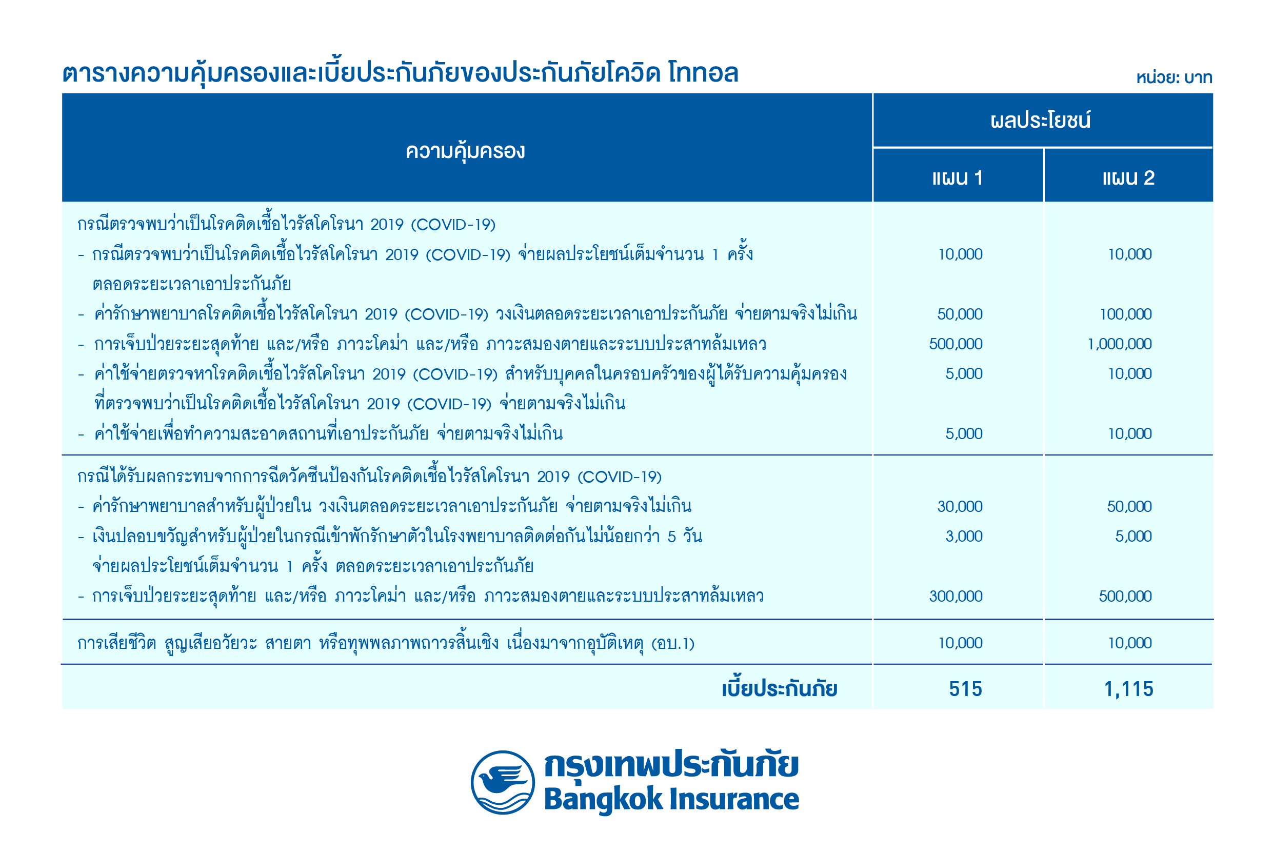 บริษัท กรุงเทพประกันภัย จำกัด (มหาชน) หรือ BKI พัฒนาแผนประกันภัยโควิด เพื่อให้ครบทุกความต้องการของลูกค้าท่ามกลางสถานการ์ณการแพร่ระบาดโรคติดเชื้อไวรัสโคโรนา 2019 (COVID-19) ปัจจุบันที่ยังพบผู้ติดเชื้อและผู้เสียชีวิตอย่างต่อเนื่อง จึงพัฒนาแผนความคุ้มครองโดยออกกรมธรรม์ประกันภัยโควิด โททอล ที่จะช่วยให้คลายความกังวลด้วยความคุ้มครองเจอจ่ายจบเมื่อตรวจพบว่าเป็นโรคติดเชื้อไวรัสโคโรนา 2019 (COVID-19) รวมถึงค่าตรวจหาเชื้อไวรัสโคโรนา 2019 (COVID-19) สำหรับคนในครอบครัว และค่าทำความสะอาดสถานที่เอาประกันภัย ครบครันถึงผลกระทบจากการฉีดวัคซีนป้องกันโรคติดเชื้อไวรัสโคโรนา 2019 (COVID-19) ทั้งค่ารักษาพยาบาลผู้ป่วยใน และเงินปลอบขวัญกรณีพักรักษาตัวในโรงพยาบาลไม่น้อยกว่า 5 วัน ตลอดจนคุ้มครองการเสียชีวิต สูญเสียอวัยวะ สายตา และทุพพลภาพถาวรสิ้นเชิงเนื่องจากอุบัติเหตุ (อบ.1) โดยแผนประกันภัยมีให้เลือกตามความเหมาะสมถึง 2 แผน เบี้ยประกันภัย 515 บาท และ 1,115 บาท มีระยะเวลาความคุ้มครอง 1 ปี สามารถทำประกันภัยดังกล่าวได้อายุตั้งแต่แรกเกิด – 100 ปี ไม่จำกัดอาชีพ ทั้งนี้ หากทำประกันภัยที่เกี่ยวกับโรคติดเชื้อไวรัสโคโรนา 2019 (COVID-19) ใดๆ อยู่แล้ว สามารถทำประกันภัยโควิด โททอลได้อีก