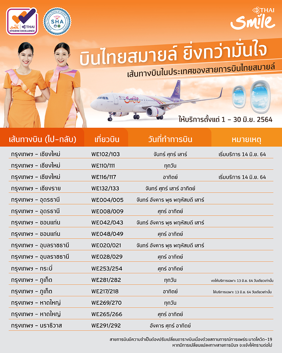 โดยสายการบินไทยสมายล์ จำเป็นต้องมีการเปลี่ยนแปลงเที่ยวบินเป็นการชั่วคราว เพื่อให้สอดคล้องกับสถานการณ์ที่เกิดขึ้น ตั้งแต่วันที่ 1-30 มิถุนายน 2564 หรือจนกว่าจะมีการเปลี่ยนแปลง โดยมีรายละเอียด ดังนี้
