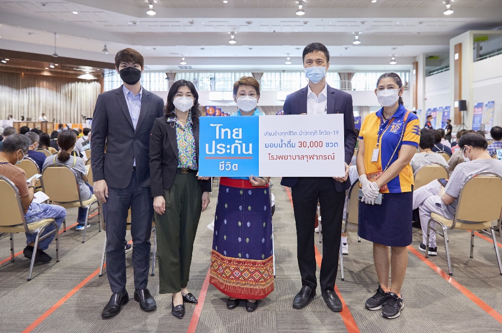 นางดวงเดือน คงคาสวัสดิ์ ผู้ช่วยกรรมการผู้จัดการใหญ่ เป็นผู้แทนบริษัท ไทยประกันชีวิต จำกัด (มหาชน) มอบน้ำดื่มน้ำใจไทยประกันชีวิต จำนวน 30,000 ขวด แก่นายแพทย์ภูมินทร์ ศิลาพันธ์ รองผู้อำนวยการ โรงพยาบาลจุฬาภรณ์ เพื่อมอบให้ประชาชนที่เข้ารับบริการฉีดวัคซีน บุคลากรทางการแพทย์ และเจ้าหน้าที่ที่ปฏิบัติภารกิจภายในศูนย์บริการฉีดวัคซีนโควิด-19 หลักของราชวิทยาลัยจุฬาภรณ์ ตามโครงการ “ไทยประกันชีวิต เคียงข้างทุกชีวิต ฝ่าวิกฤติ โควิด –19” ในภารกิจสนับสนุนการฉีดวัคซีนเพื่อคนไทย ณ CAT Convention Hall ถนนแจ้งวัฒนะ