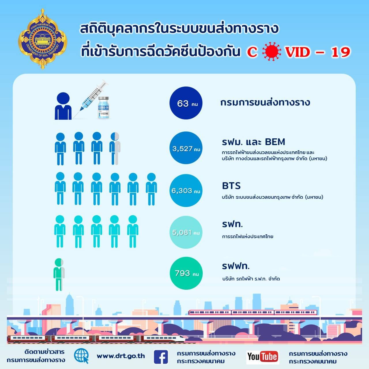 ทั้งนี้ ขร. มีจำนวนเจ้าหน้าที่ที่เข้ารับการฉีดวัคซีนครบ 100% และจากรายงานผลการฉีดวัคซีนของกระทรวงคมนาคมรวมถึงรายงานผลการฉีดวัคซีนจากหน่วยงานต่างๆ ในระบบขนส่งทางราง พบว่า เจ้าหน้าที่และบุคลากรของหน่วยงานผู้ให้บริการในระบบขนส่งทางราง จำนวนกว่า 15,767 คน ได้รับการฉีดวัคซีนป้องกันไวรัสโควิด-19 แล้ว แบ่งเป็นขร. จำนวน 63 คน, รฟม.-BEM จำนวน 3,527 คน, BTS จำนวน 6,303 คน, รฟท. จำนวน 5,081 คน และ รฟฟท. 793 คน