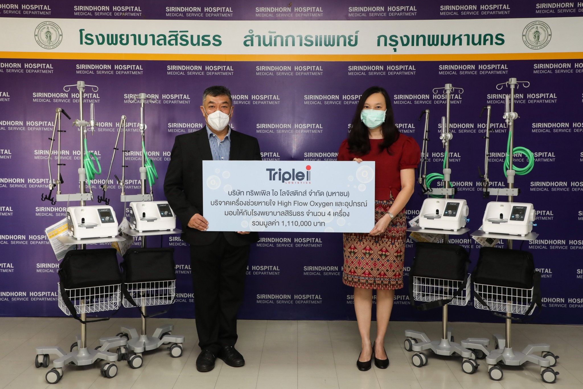 นายธนัท ตาตะยานนท์ (ซ้าย) กรรมการ บริษัท ทริพเพิล ไอ โลจิสติกส์ จำกัด (มหาชน) หรือ iii เป็นตัวแทนบริษัทฯ มอบเครื่องช่วยหายใจ High Flow Oxygen จำนวน 4 เครื่อง พร้อมอุปกรณ์ มูลค่ารวม 1,110,000 บาท ให้กับโรงพยาบาลสิรินธร สำนักการแพทย์ กรุงเทพมหานคร เพื่อสนับสนุนเครื่องมือสำคัญแก่บุคลากรทางการแพทย์ในการช่วยเหลือผู้ป่วยของโรงพยาบาลที่อยู่ระหว่างการเข้ารักษาโรคไวรัสโควิด-19 โดยมี พญ.คัชรินทร์ เจียมศรีพงษ์ (ขวา) ผู้อำนวยการโรงพยาบาล เป็นผู้รับมอบ ณ รพ.สิรินธร กรุงเทพฯ