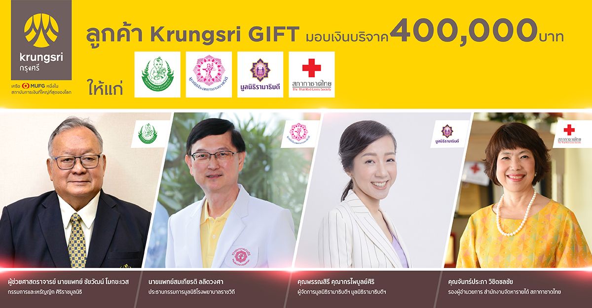 ธนาคารกรุงศรีอยุธยา จํากัด (มหาชน) เป็นตัวแทนลูกค้ากรุงศรีที่ใช้ Krungsri GIFT แลกเป็นเงินบริจาคจำนวนทั้งสิ้น 400,000 บาท ภายใต้โครงการ Krungsri GIFT for GIVE ที่จัดขึ้นระหว่างวันที่ 1-30 มิถุนายน 2564 โดยทุก 1 กิฟท์ ที่ลูกค้ากดแลก มีค่าเท่ากับ 40 บาท เพื่อร่วมบริจาคเงินสมทบทุน ให้แก่ ศิริราชมูลนิธิ, มูลนิธิโรงพยาบาลราชวิถี, มูลนิธิรามาธิบดีฯ และ สภากาชาดไทย เพื่อร่วมเป็นส่วนหนึ่งในการสนับสนุนบุคลากรทางการแพทย์ให้มีความพร้อมรับมือกับสถานการณ์ COVID-19
