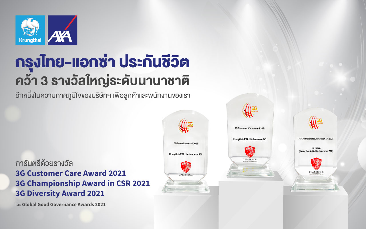 บมจ.กรุงไทย-แอกซ่า ประกันชีวิต คว้า 3 รางวัลใหญ่ระดับนานาชาติ จาก Global Good Governance Awards 2021 ในสาขา 1. 3G Customer Care Award 2021 2. 3G Championship Award in CSR 2021 for Go Green และ 3. 3G Diversity Award 2021 ซึ่งเป็นอีกหนึ่งความภาคภูมิใจของบริษัทฯ ที่ประสบความสำเร็จในการยึดมั่นให้บริการลูกค้าอย่างดีที่สุด โดยมีนโยบายการมีลูกค้าเป็นมาเป็นที่หนึ่ง พร้อมทั้งด้านการช่วยเหลือสังคมอย่างยั่งยืนตลอดมา และการส่งเสริมด้านความหลากหลายทางเพศ ซึ่งสอดคล้องเป้าหมายหลักของบริษัทฯ ที่มุ่งมั่นเคียงข้างทุกความเชื่อมั่น ดูแลกันตลอดไป
