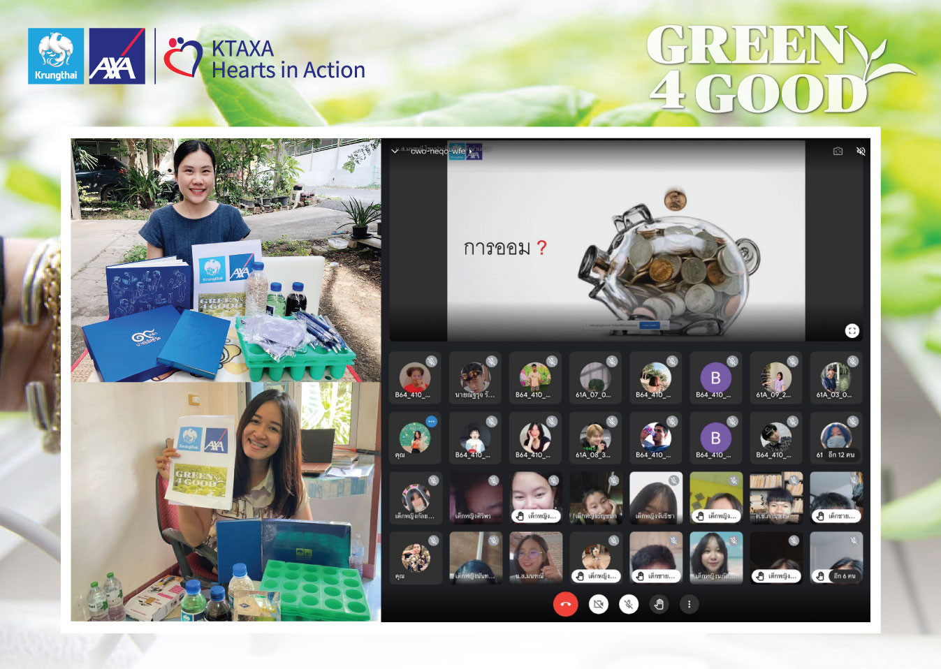 บมจ.กรุงไทย-แอกซ่า ประกันชีวิต ร่วมกับมูลนิธิครอบครัวพอเพียง จัดกิจกรรม “Green4Good ปี 4” ซึ่งบริษัทฯ ยังคงมุ่งมั่นในการดำเนินการในโครงการดังกล่าว เพื่อช่วยเหลือสังคม และให้ความรู้แก่เยาวชนอย่างต่อเนื่อง ถึงแม้จะอยู่ในช่วงสถานการณ์การแพร่ระบาดของเชื้อไวรัสโควิด-19 โดยบริษัทฯ ได้ปรับรูปแบบการสอน และกิจกรรมผ่านช่องทางออนไลน์ โดยให้ความรู้ ความเข้าใจพื้นฐานด้านการออมอย่างถูกต้องแก่เยาวชนไทย พร้อมทั้งสร้างความตระหนักรู้เรื่อง การเปลี่ยนแปลงสภาพภูมิอากาศ (Climate change) พร้อมให้ความสำคัญด้านสุขภาพผ่าน “การปลูกผักไฮโดรโปนิกส์”