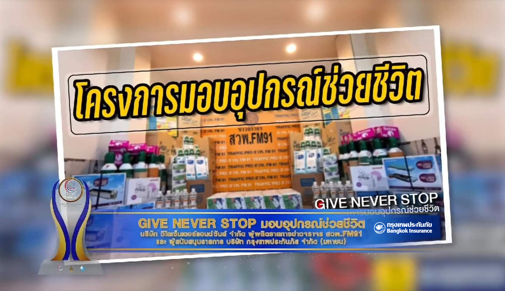 โครงการ GIVE NEVER STOP มอบอุปกรณ์ช่วยชีวิต โดยสถานีวิทยุข่าวจราจร สวพ.FM91 และมีบริษัท กรุงเทพประกันภัย จำกัด (มหาชน) เป็นผู้ให้การสนับสนุนหลัก ได้รับรางวัลสื่อสร้างสรรค์คุณธรรมอวอร์ด ปี 2563 (Moral Media Award 2020) จัดโดยศูนย์คุณธรรม (องค์การมหาชน) ซึ่งจัดขึ้นเป็นปีแรกและเป็นส่วนหนึ่งในงานสมัชชาคุณธรรมแห่งชาติ ครั้งที่ 11 ในรูปแบบ virtual live ผ่านทาง Facebook ศูนย์คุณธรรม และ Facebook กองทุนพัฒนาสื่อปลอดภัยและสร้างสรรค์ โดยมีนายอิทธิพล คุณปลื้ม รัฐมนตรีว่าการกระทรวงวัฒนธรรม เป็นประธาน ทั้งนี้ เพื่อเป็นประกาศยกย่องให้รางวัลแก่บุคคล หน่วยงานที่ผลิต โดยนำแง่มุมที่เกี่ยวข้องด้านคุณธรรมที่ส่งผลกระทบต่อจิตสำนึกและเกิดประโยชน์ต่อสังคมส่วนรวมอย่างกว้างขวางมาเผยแพร่และขยายผลในสื่อรูปแบบต่างๆ ให้ประชาชนได้รับรู้ เข้าใจ และเกิดแรงบันดาลใจในการทำความดีด้านต่างๆ เมื่อเร็วๆ นี้
