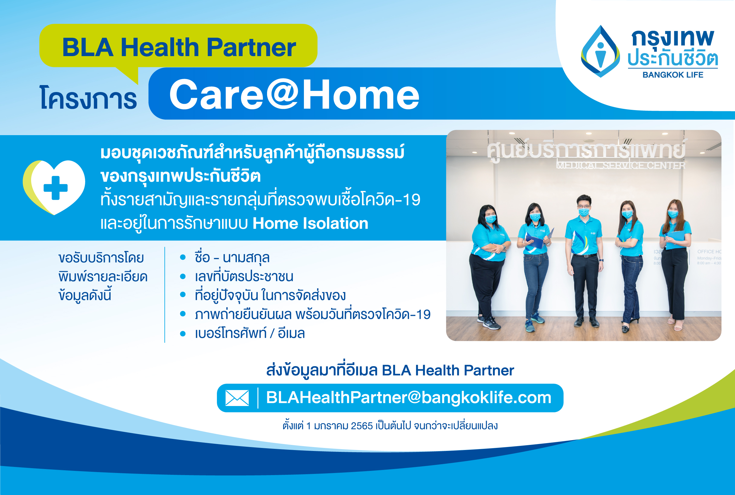 สำหรับลูกค้าผู้ถือกรมธรรม์ของกรุงเทพประกันชีวิตทั้งรายสามัญและรายกลุ่ม ที่ตรวจพบเชื้อโควิด-19 และอยู่ในการรักษาแบบ Home Isolation สามารถติดต่อมายังโครงการ BLA Health Partner Care@Home เพื่อขอรับชุดเวชภัณฑ์สำหรับดูแลตัวเอง ผ่านอีเมล blahealthpartner@bangkoklife.com โดยแจ้งข้อมูลดังนี้