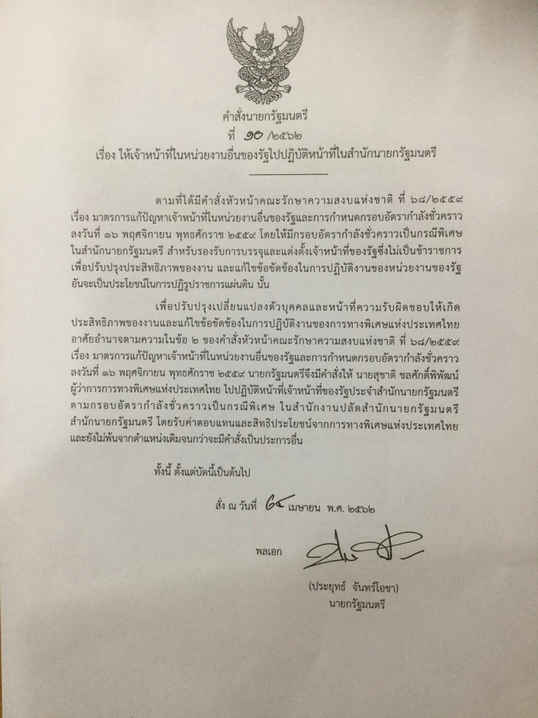 รายงานข่าวจากกระทรวงคมนาคม ระบุว่า เมื่อวันที่ 24 เม.ย. 2562 ที่ผ่าน พลเอกประยุทธ์ จันทร์โอชา นายกรัฐมนตรี ลงนามในคำสั่งนายกรัฐมนตรี ที่ 10/2562 เรื่องให้เจ้าหน้าที่ในหน่วยงานอื่นของรัฐไปปฎิบัติหน้าที่ในสำนักนายกรัฐมนตรี ใจความว่า ตามที่ได้มีคำสั่งหัวหน้าคณะรักษาความสงบแห่งชาติที่ 68/2559 เรื่องมาตรการแก้ไขปัญหาเจ้าหน้าที่ในหน่วยงานอื่นของรัฐและการกำหนดกรอบอัตรากำลังชั่วคราวลงวันที่ 16 พฤศจิกายน พ.ศ. 2559 โดยให้มีกรอบอัตรากำลังชั่วคราวเป็นกรณีพิเศษในสำนักนายกรัฐมนตรี สำหรับรองรับการบรรจุและแต่งตั้งเจ้าหน้าที่ของรัฐซึ่งไม่เป็นข้าราชการเพื่อปรับปรุงประสิทธิภาพของงาน และแก้ไขข้อขัดข้องในการปฏิบัติงานของหน่วยงานของรัฐอันจะเป็นประโยชน์ในการปฏิรูปราชการแผ่นดินนั้น