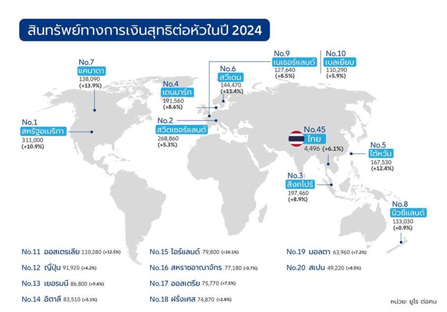ปี 2024 เป็นอีกหนึ่งปีที่เศรษฐกิจโลกเติบโตอย่างมั่นคง และเป็นปีทองของสินทรัพย์การเงินภาคครัวเรือน โดยเพิ่มขึ้น 8.7% สูงกว่าปี 2023 ที่ 8.0% ณ สิ้นปี 2024 มูลค่าสินทรัพย์การเงินรวมทั่วโลกแตะ 269 ล้านล้านยูโร ซึ่งเป็นสถิติสูงสุดใหม่ อย่างไรก็ดี เมื่อเทียบกับกิจกรรมทางเศรษฐกิจ สัดส่วนสินทรัพย์การเงินต่อเศรษฐกิจอยู่ที่ 283% ซึ่งเท่ากับระดับปี 2017
