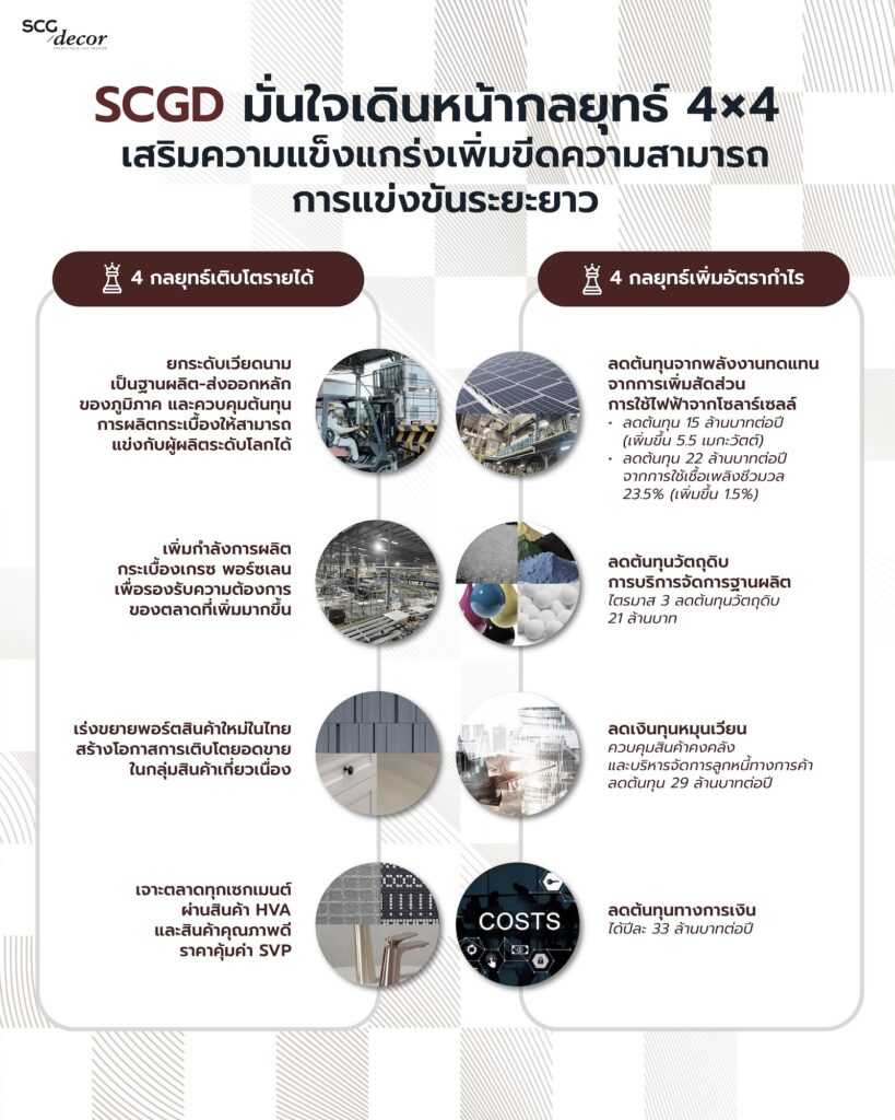แม้ภาพรวมตลาดวัสดุตกแต่งพื้นผิวและก่อสร้างยังเผชิญความท้าทายจากภาวะเศรษฐกิจและการแข่งขันรุนแรง แต่ SCGD ยังสามารถรักษาความสามารถในการแข่งขันได้อย่างแข็งแกร่ง จากการบริหารจัดการต้นทุนอย่างมีประสิทธิภาพ และการมุ่งพัฒนาสินค้า HVA และกลุ่มสินค้าใหม่ที่สร้างมูลค่าเพิ่มให้กับธุรกิจและตอบโจทย์ความต้องการของผู้บริโภคยุคใหม่ ขณะเดียวกัน ยังเดินหน้าขยายศักยภาพการผลิตในต่างประเทศโดยเฉพาะเวียดนาม ซึ่งเป็นฐานการผลิตและส่งออกหลักของภูมิภาคอาเซียน เพื่อรองรับความต้องการวัสดุก่อสร้างที่ฟื้นตัวขึ้นในประเทศรวมถึงการขยายสู่ตลาดโลกในอนาคต มั่นใจเดินหน้าเสริมความแข็งแกร่งและเพิ่มขีดความสามารถการแข่งขันระยะยาวด้วยกลยุทธ์ 4×4 ดังนี้