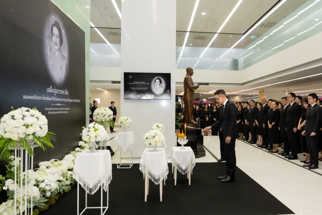 ในโอกาสนี้ นายสาระ ล่ำซำ ประธานเจ้าหน้าที่บริหาร ได้กล่าวถวายความอาลัย พร้อมกันนี้ คณะผู้บริหารและพนักงาน ได้พร้อมใจกันยืนสงบนิ่ง และลงนามในสมุดถวายความอาลัย เพื่อแสดงความจงรักภักดี และน้อมรำลึกถึงพระมหากรุณาธิคุณที่ทรงมีต่อพสกนิกรชาวไทย ตลอดระยะเวลาที่ทรงปฏิบัติพระราชกรณียกิจน้อยใหญ่นานัปการ ตามที่ทรงตั้งพระราชปณิธานอย่างแน่วแน่ ในการบำเพ็ญพระราชกรณียกิจมาตลอดพระชนม์ชีพ เพื่อบำบัดทุกข์บำรุงสุข แก่พสกนิกรชาวไทยในทุกหนแห่ง อีกทั้งยังทรงส่งเสริมงานด้านศิลปวัฒนธรรม หัตถศิลป์ไทย ตลอดจนการอนุรักษ์ธรรมชาติและสิ่งแวดล้อม รวมทั้งการพัฒนาคุณภาพชีวิตของประชาชนในถิ่นทุรกันดาร ซึ่งสะท้อนถึงพระเมตตาของสมเด็จพระนางเจ้าสิริกิติ์ พระบรมราชินีนาถ พระบรมราชชนนีพันปีหลวง สมดังพระราชสมัญญา “พระแม่ของแผ่นดิน”