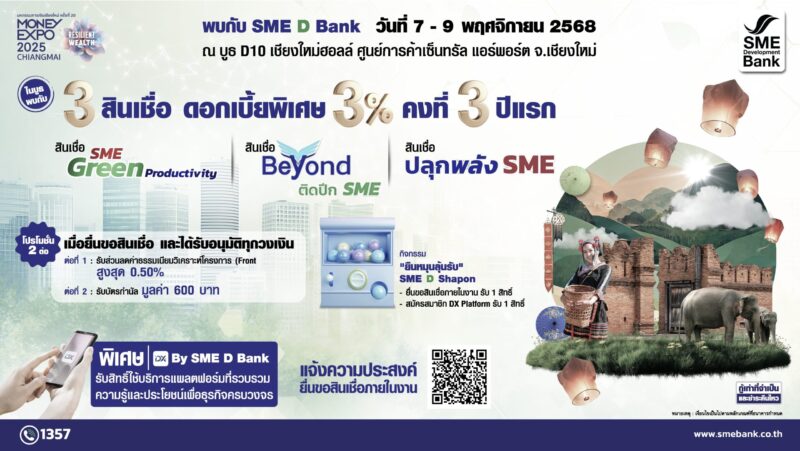 ธนาคารพัฒนาวิสาหกิจขนาดกลางและขนาดย่อมแห่งประเทศไทย (ธพว.)หรือ SME D Bank เข้าร่วมงานมหกรรมการเงินเชียงใหม่ ครั้งที่ 20 (MONEY EXPO 2025 CHIANGMAI) ระหว่างวันที่ 7-9 พฤศจิกายน2568 ณ บูธ D10 เชียงใหม่ฮอลล์ เซ็นทรัลแอร์พอร์ต เชียงใหม่ จังหวัดเชียงใหม่ ยกทัพบริการ “พัฒนาคู่เติมทุน” สนับสนุนให้ผู้ประกอบการเอสเอ็มอี คว้าโอกาสธุรกิจเติบโตและต่อยอดจากนโยบาย Quick Big Win ของรัฐบาล ที่มุ่ง “กระตุ้นสั้น ได้ยาว กระจายตัว” เช่น โครงการคนละครึ่งพลัสและมาตรการกระตุ้นการท่องเที่ยว เป็นต้น ด้วยโปรโมชัน ด้านการเงิน ผ่านผลิตภัณฑ์สินเชื่ออัตราดอกเบี้ยต่ำพิเศษเพียง 3% ต่อปี คงที่ตลอด 3 ปีแรก ผ่อนชำระนานสูงสุด 10 ปี ครอบคลุมทุกความต้องการและทุกกลุ่มธุรกิจเอสเอ็มอี ได้แก่ 1.สินเชื่อ “SME Green Productivity” วงเงินกู้สูงสุด 10 ล้านบาท 2.สินเชื่อ “ปลุกพลัง SME” วงเงินกู้สูงสุด 1.5 ล้านบาท และ 3.สินเชื่อ “Beyond ติดปีก SME” วงเงินกู้สูงสุด 15 ล้านบาท ควบคู่บริการ ด้านการพัฒนา เพิ่มศักยภาพธุรกิจเอสเอ็มอี ด้วยแพลตฟอร์ม DX by SME D Bank (dx.smebank.co.th) ช่วย Upskill Reskill เรียนรู้ได้ด้วยตัวเองตลอด 24 ชม. รวมทั้ง ให้คำปรึกษาแก้ปัญหาหนี้อย่างยั่งยืน ช่วยเหลือผู้ประกอบการเอสเอ็มอีกลุ่มเปราะบาง พลิกฟื้นกิจการกลับมาเดินหน้าได้อีกครั้ง ผ่านมาตรการ “3 ลด ปลดหนี้” เป็นต้น