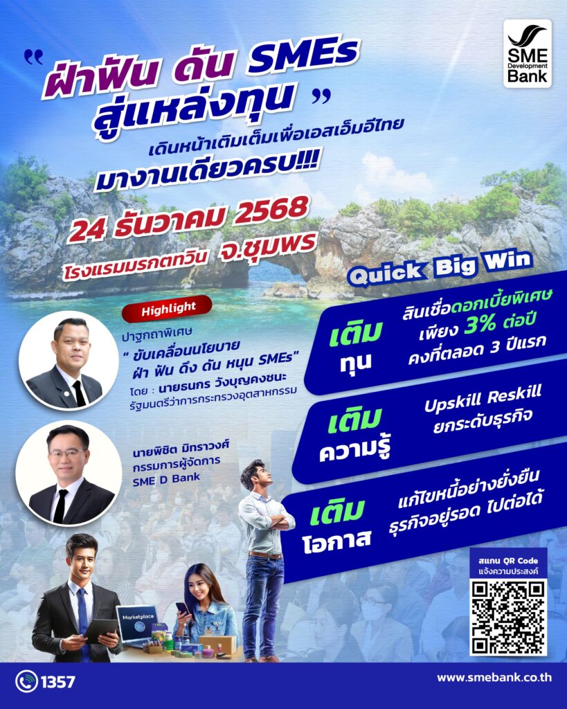 ธนาคารพัฒนาวิสาหกิจขนาดกลางและขนาดย่อมแห่งประเทศไทย (ธพว.) หรือ SME D Bank เดินหน้าเต็มกำลังขับเคลื่อนนโยบาย “Quick Big Win” ของรัฐบาล สนับสนุนผู้ประกอบการเอสเอ็มอี เดินหน้าคว้าโอกาสธุรกิจเติบโตช่วงโค้งสุดท้ายปี 2568 จัดกิจกรรม “ฝ่าฟัน ดัน SMEs สู่แหล่งทุน” มอบบริการ “3 เติม” ช่วยธุรกิจครบถ้วนในจุดเดียว ได้แก่ 1.“เติมทุน” เข้าถึงสินเชื่ออัตราดอกเบี้ยพิเศษเพียง 3% ต่อปี คงที่ตลอด 3 ปีแรก ผ่อนชำระนานสูงสุด 10 ปี วงเงินกู้สูงสุด 15 ล้านบาท ยื่นกู้ได้ทันทีในงาน 2. “เติมความรู้” ยกระดับกิจการ พัฒนาธุรกิจ Upskill Reskill ด้วยแพลตฟอร์ม DX by SME D Bank (dx.smebank.co.th) สะดวกสบาย ใช้บริการได้ตลอด 24 ชม. และ 3.“เติมโอกาสแก้ไขหนี้อย่างยั่งยืน” ด้วยมาตรการ “3 ลด ปลดหนี้” ช่วยลดภาระการเงิน สร้างโอกาสพลิกฟื้นกิจการ