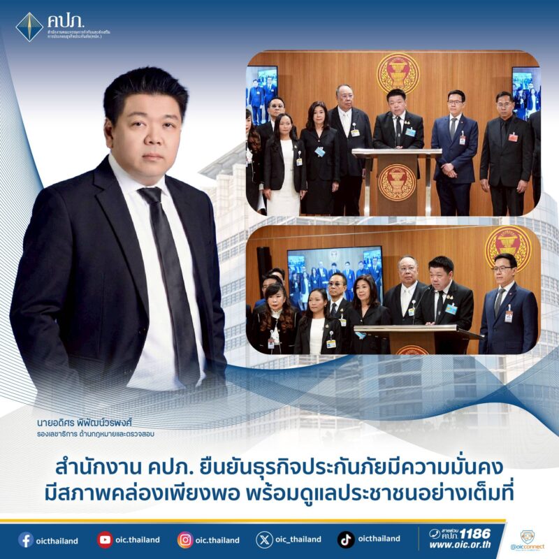 เมื่อวันที่ 4 ธันวาคม 2568 นายชูฉัตร ประมูลผล เลขาธิการคณะกรรมการกำกับและส่งเสริมการประกอบธุรกิจประกันภัย (เลขาธิการ คปภ.) มอบหมายให้นายอดิศร พิพัฒน์วรพงศ์ รองเลขาธิการด้านกฎหมายและตรวจสอบ แถลงข่าวร่วมกับคณะอนุกรรมาธิการตลาดทุนและธุรกิจประกันภัย วุฒิสภา สมาคมประกันวินาศภัยไทย และสมาคมประกันชีวิตไทย โดยสำนักงาน คปภ. ยืนยันธุรกิจประกันภัย มีความมั่นคง มีสภาพคล่องเพียงพอ พร้อมดูแลประชาชนอย่างเต็มที่