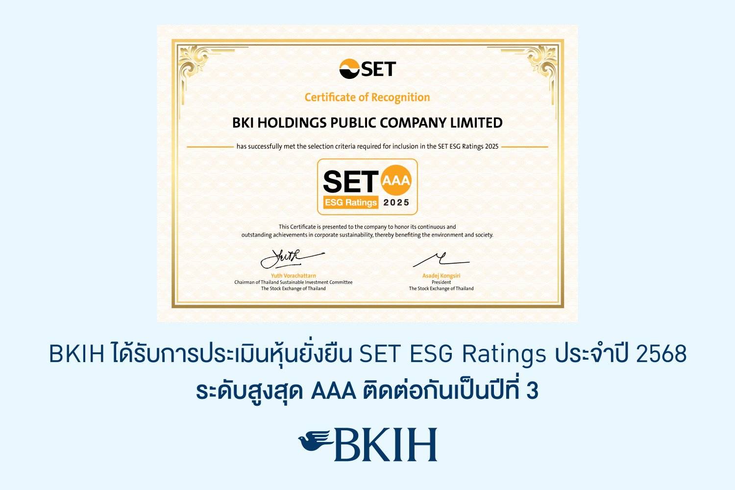 BKIH คว้าหุ้นยั่งยืน SET ESG Ratings ประจำปี 2568 ระดับสูงสุด AAA ติดต่อกัน 3 ปีซ้อน ตอกย้ำการดำเนินธุรกิจที่ยั่งยืนอย่างต่อเนื่อง