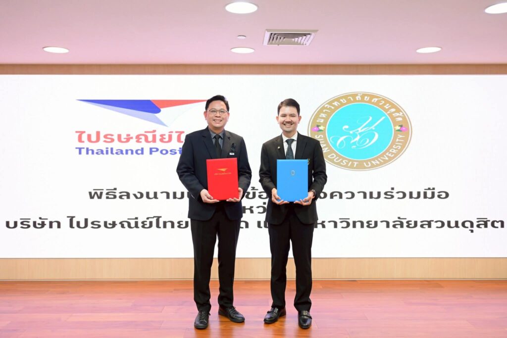 บริษัท ไปรษณีย์ไทย จำกัด นำโดย นายพิษณุ วานิชผล ประธานเจ้าหน้าที่บริหารสายงานพัฒนาประสิทธิภาพองค์กร นางสาวปิลันธนี สุวรรณบุบผา ประธานเจ้าหน้าที่บริหารสายงานธุรกิจองค์กร ร่วมลงนามบันทึกข้อตกลงความร่วมมือทางวิชาการกับมหาวิทยาลัยสวนดุสิต นำโดย รศ.ดร.ชนะศึก นิชานนท์ รองอธิการบดีฝ่ายบริหารวิจัยและนวัตกรรม เพื่อพัฒนาเทคโนโลยีออนไลน์มาร์เก็ตเพลสสินค้ากุ้งก้ามกรามมีชีวิต ยกระดับกระบวนการขนส่งสินค้าเกษตรมูลค่าสูงให้มีประสิทธิภาพ ตอบโจทย์ผู้บริโภคยุคดิจิทัล และส่งเสริมเศรษฐกิจชุมชนอย่างยั่งยืน ณ ห้องประชุมชั้น 5 อาคารบริหารไปรษณีย์ไทย