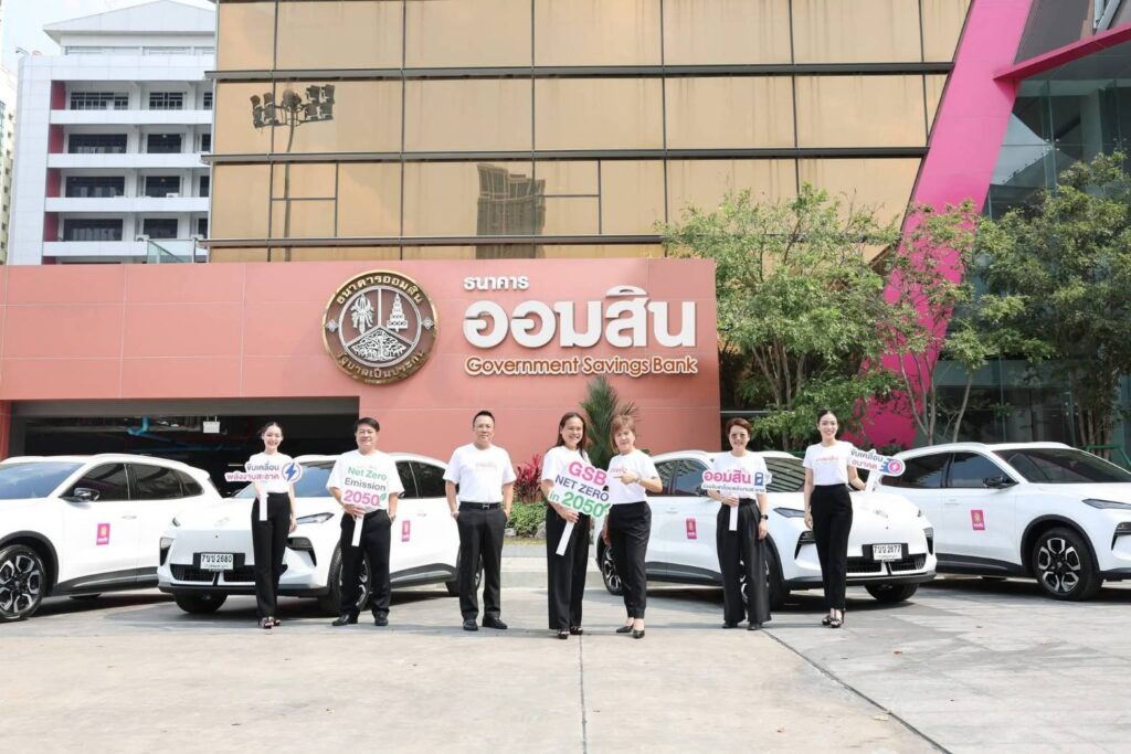 นางสาววชิรา การสุทธิ์ รองผู้อำนวยการธนาคารออมสิน กลุ่มการตลาดเพื่อความยั่งยืน และนางญดาภรณ์ ศรีพัฒน์ รองผู้อำนวยการธนาคารออมสิน กลุ่มปฏิบัติการ พร้อมคณะผู้บริหาร รับมอบรถยนต์ไฟฟ้าล็อตใหม่สำหรับใช้ในภารกิจของธนาคารออมสิน สำนักงานใหญ่ กรุงเทพฯ ตามแผนการดำเนินงานเพื่อมุ่งสู่เป้าหมายการปล่อยก๊าซเรือนกระจกสุทธิเป็นศูนย์ หรือ GSB Net Zero Roadmap ภายในปี 2050 ซึ่งภายใต้แผนดังกล่าวธนาคารตั้งเป้าหมายการเปลี่ยนมาใช้รถยนต์ไฟฟ้า ทดแทนการใช้รถเครื่องยนต์สันดาปในการปฏิบัติงานให้ครบทั้งที่สำนักงานใหญ่ และในภารกิจของสายงานกิจการสาขาทุกภูมิภาคทั่วประเทศ ภายในปี 2030