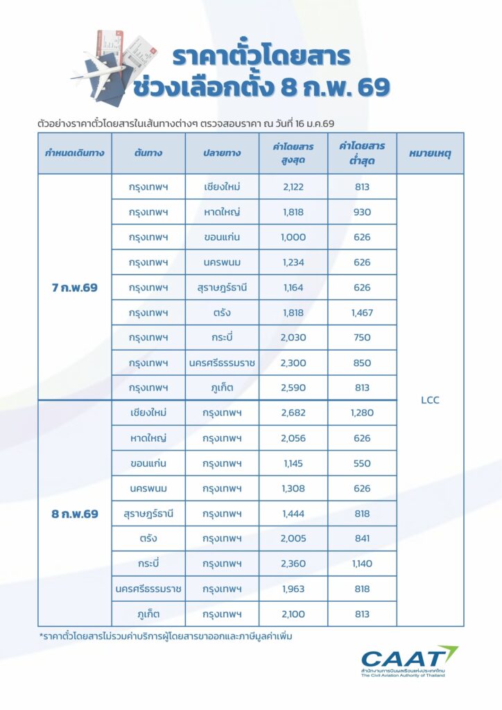 ทั้งนี้ จากการตรวจสอบราคาค่าโดยสารในช่วงวันที่ 7–8 กุมภาพันธ์ 2569 พบว่า ทุกเส้นทางบินภายในประเทศยังไม่มีการจำหน่ายตั๋วโดยสารเกินอัตราเพดานราคาที่ กพท. กำหนด และบางเส้นทางยังคงมีตั๋วโดยสารในระดับราคาต่ำกว่า 1,000 บาท ให้ประชาชนสามารถเลือกซื้อเพื่อเดินทางกลับภูมิลำเนาไปใช้สิทธิเลือกตั้งได้ โดยจากการตรวจสอบราคาตั๋วโดยสาร เมื่อวันที่ 16 มกราคม 2569 พบว่า เส้นทางกรุงเทพฯ-เชียงใหม่ ช่วงวันที่ 7 กุมภาพันธ์ 2569 ราคาตั๋วโดยสาร (ไม่รวมค่าบริการผู้โดยสารขาออกและภาษีมูลค่าเพิ่ม) ต่ำสุดอยู่ที่ 813 บาท เส้นทางกรุงเทพฯ-หาดใหญ่ ราคาตั๋วโดยสารต่ำสุดอยู่ที่ 930 บาท เส้นทางกรุงเทพฯ-นครพนม ราคาตั๋วโดยสารต่ำสุดอยู่ที่ 626 บาท