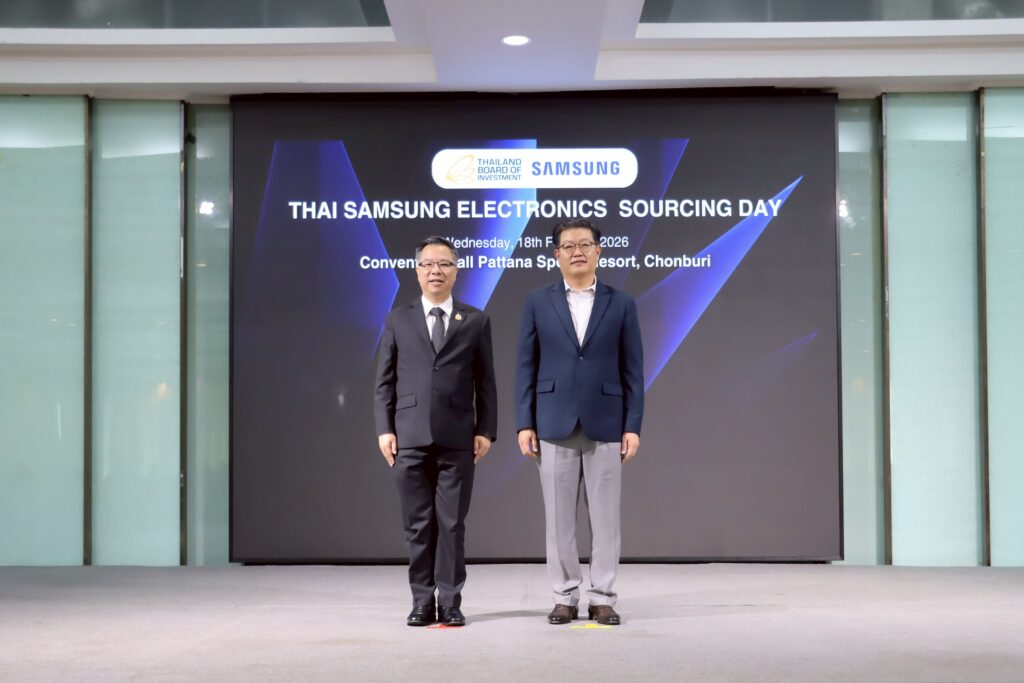 นายนฤตม์ เทอดสถีรศักดิ์ เลขาธิการคณะกรรมการส่งเสริมการลงทุน (บีโอไอ) เปิดเผยว่า ตามที่บีโอไอได้ผลักดันนโยบายส่งเสริมการใช้ชิ้นส่วนในประเทศ (Local Content) มาอย่างต่อเนื่อง โดยเฉพาะในกลุ่มอุตสาหกรรมยานยนต์ไฟฟ้า เครื่องใช้ไฟฟ้าและอิเล็กทรอนิกส์ ในครั้งนี้ บีโอไอได้ร่วมกับบริษัท ไทยซัมซุง อิเลคโทรนิคส์ จำกัด ผู้นำเทคโนโลยีเครื่องใช้ไฟฟ้าอัจฉริยะระดับโลกจากเกาหลีใต้ จัดงานจับคู่เจรจาธุรกิจ “Thai Samsung Electronics Sourcing Dayเมื่อวันที่ 18 กุมภาพันธ์ 2569 ณ ห้องคอนเวนชั่นฮอลล์ พัฒนาสปอร์ตรีสอร์ท จังหวัดชลบุรี เพื่อส่งเสริมการจัดซื้อชิ้นส่วนที่ผลิตภายในประเทศ และสนับสนุนผู้ประกอบการไทยโดยเฉพาะ SMEs ให้เข้ามาเป็นส่วนหนึ่งของซัพพลายเชนอุตสาหกรรมเครื่องใช้ไฟฟ้าที่กำลังเติบโตในตลาดโลก โดยมีผู้ผลิตชิ้นส่วนในประเทศเข้าร่วมเจรจาธุรกิจกับกลุ่มซัมซุงกว่า 200 คน จาก 71 บริษัท ขณะที่ นายจู ฮยอนแทประธานบริษัท ไทยซัมซุง อิเลคโทรนิคส์ ได้นำทีมงานฝ่ายจัดซื้อเข้าร่วมงานด้วยตัวเอง พร้อมด้วยผู้บริหารจากสมาคมรับช่วงการผลิตไทย และสมาคม PCB มาร่วมสนับสนุนงานด้วย