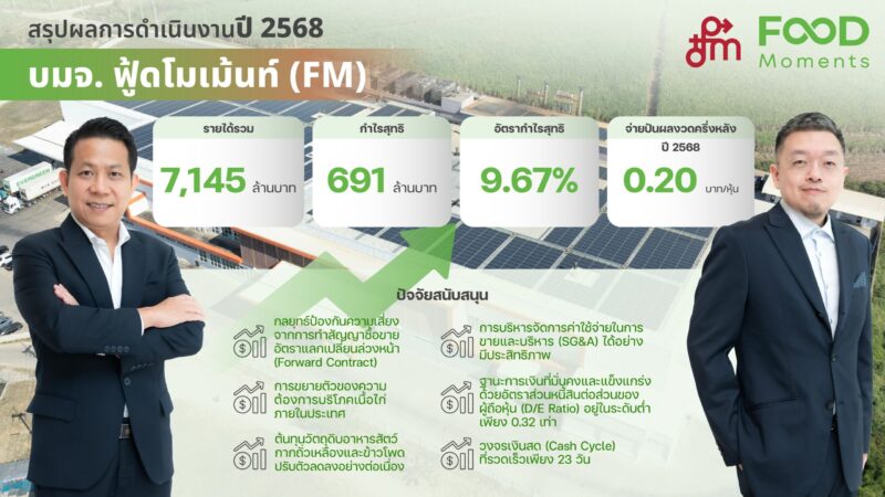 บริษัท ฟู้ดโมเม้นท์ จำกัด (มหาชน) หรือ FM โชว์ผลงานปี 2568 แข็งแกร่ง ทำรายได้รวม 7,145 ล้านบาท กำไรจากการดำเนินงานพุ่ง 816 ล้านบาท และกำไรสุทธิ 691 ล้านบาท แม้ได้รับผลกระทบชั่วคราวจากภาษีที่เพิ่มขึ้นและเงินบาทแข็งค่า พร้อมรักษาอัตรากำไรสุทธิในระดับสูง 9.67% เตรียมจ่ายปันผลอีก 0.20 บาทต่อหุ้น ขึ้นเครื่องหมาย XD วันที่ 8 พ.ค.นี้ ขณะที่ปี 2569 คาดรับอานิสงส์สิทธิประโยชน์ BOI ใหม่เต็มปี เสริมศักยภาพทำกำไรระยะยาว