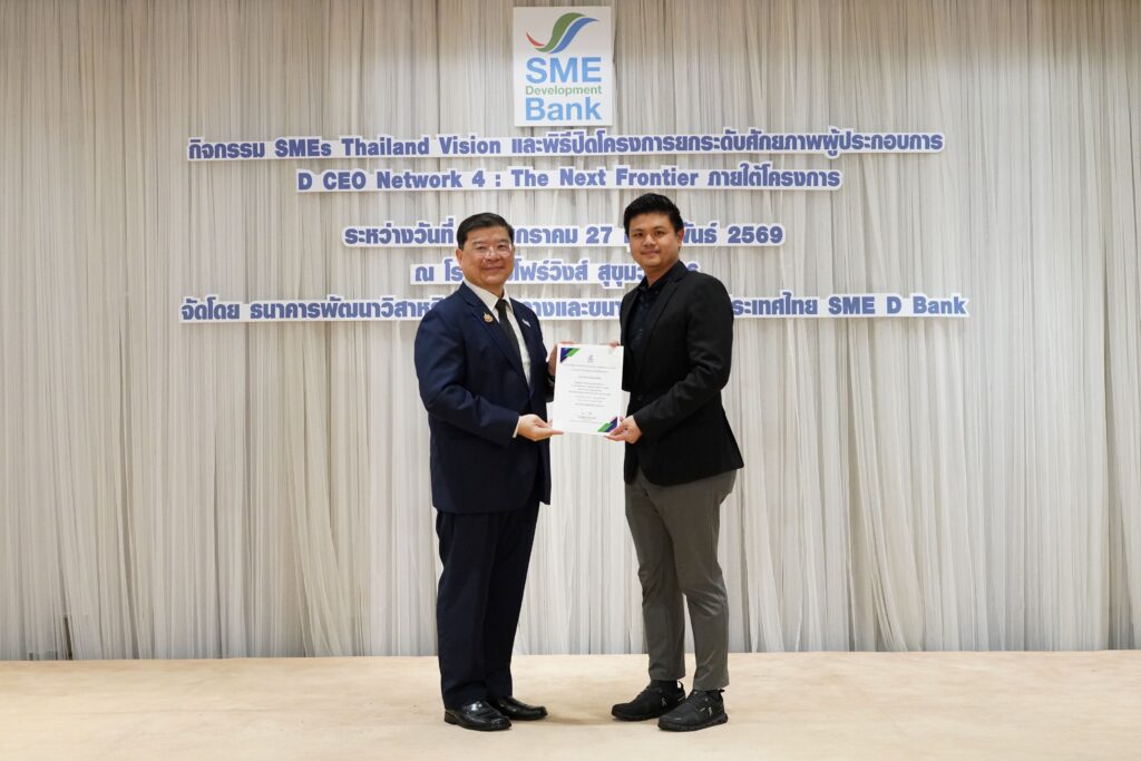 นายพิชิต มิทราวงศ์ กรรมการผู้จัดการ ธนาคารพัฒนาวิสาหกิจขนาดกลางและขนาดย่อมแห่งประเทศไทย (ธพว.) หรือ SME D Bank พร้อมด้วยคณะผู้บริหารธนาคาร และหน่วยงานพันธมิตร ร่วมแสดงความยินดีในการมอบใบประกาศนียบัตร ให้แก่ผู้ประกอบการเอสเอ็มอี ซึ่งล้วนเป็นระดับ CEO ทั้งเจ้าของกิจการ ผู้บริหาร หรือทายาทธุรกิจ จำนวน 117 กิจการ ที่สำเร็จหลักสูตรโครงการ “D CEO Network” รุ่นที่ 4 ประจำปี 2569 ภายใต้แนวคิด “ทะยานสู่ขอบฟ้าใหม่” (The Next Frontier) ซึ่งโครงการดังกล่าว สำเร็จตามเป้าหมาย สามารถเพิ่มศักยภาพธุรกิจให้แก่เจ้าของกิจการ โดยเฉพาะด้านการวางกลยุทธ์ใช้เทคโนโลยีดิจิทัล ปัญญาประดิษฐ์ (AI) ประยุกต์ใช้ในการยกระดับธุรกิจ ตลอดจน ได้รับการเสริมทักษะการเงินยุคใหม่ การขยายตลาดต่างประเทศ และการพัฒนาโมเดลธุรกิจสอดคล้องกับแนวทาง ESG ตลอดจน เกิดการสร้างเครือข่ายธุรกิจคุณภาพในหมู่เจ้าของกิจการด้วยกันเอง ที่สำคัญ สร้างโอกาสเข้าถึงแหล่งทุนจาก SME D Bank ผ่านการยื่นขอสินเชื่อและร่วมลงทุนรวม 27 ราย รวมวงเงินกว่า 348ล้านบาท ณ ชั้น 3 โรงแรมโฟร์วิงส์ สุขุมวิท 26 เมื่อวันที่ 27 กุมภาพันธ์ 2569 ที่ผ่านมา