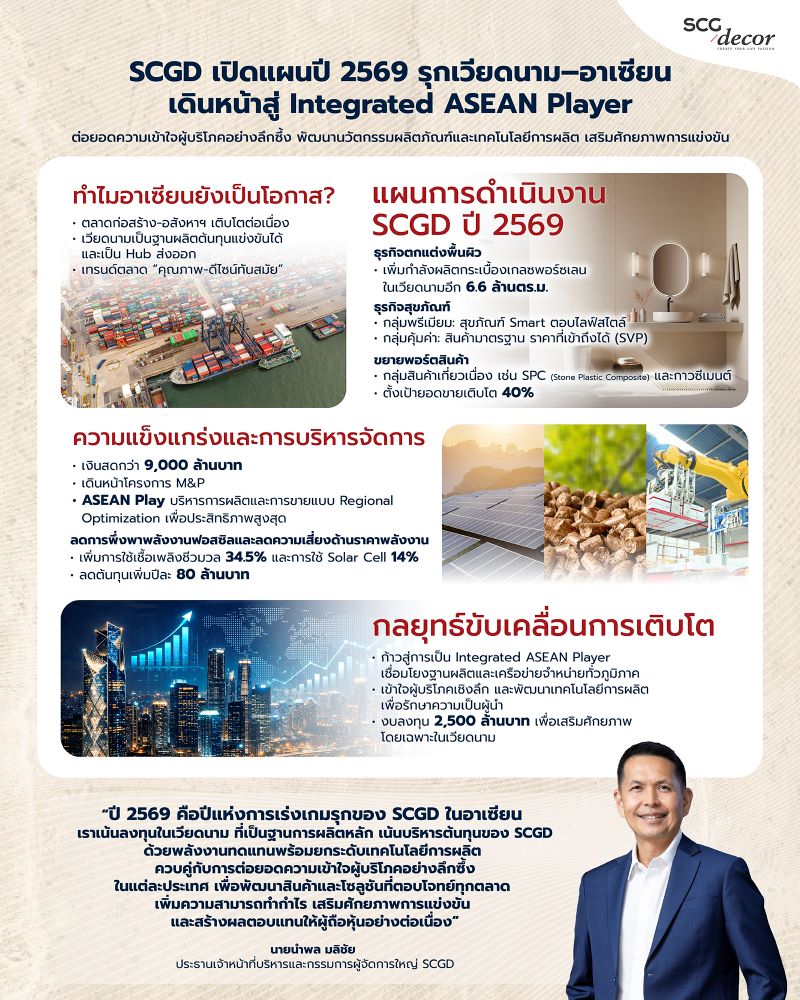 นายนำพล มลิชัย ประธานเจ้าหน้าที่บริหารและกรรมการผู้จัดการใหญ่ บริษัทเอสซีจี เดคคอร์ จำกัด (มหาชน) หรือ SCG Decor (SCGD)  เปิดเผยว่า “SCGD มุ่งขับเคลื่อนการเติบโตในอาเซียนควบคู่กับการบริหารต้นทุนอย่างมีวินัย โดยตั้งเป้าหมายสู่การเป็น Integrated ASEAN Player ผ่านการเชื่อมโยงฐานการผลิต