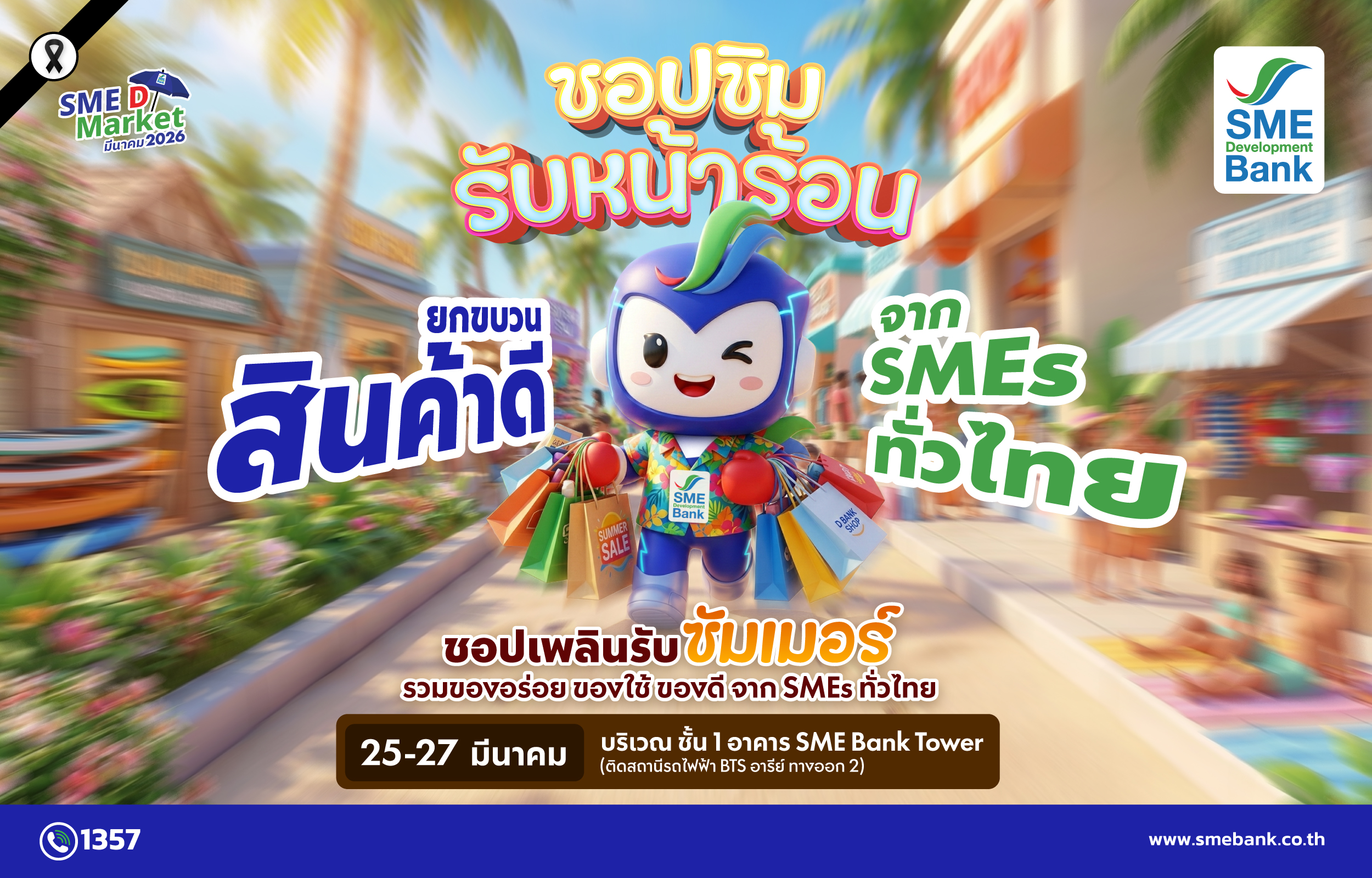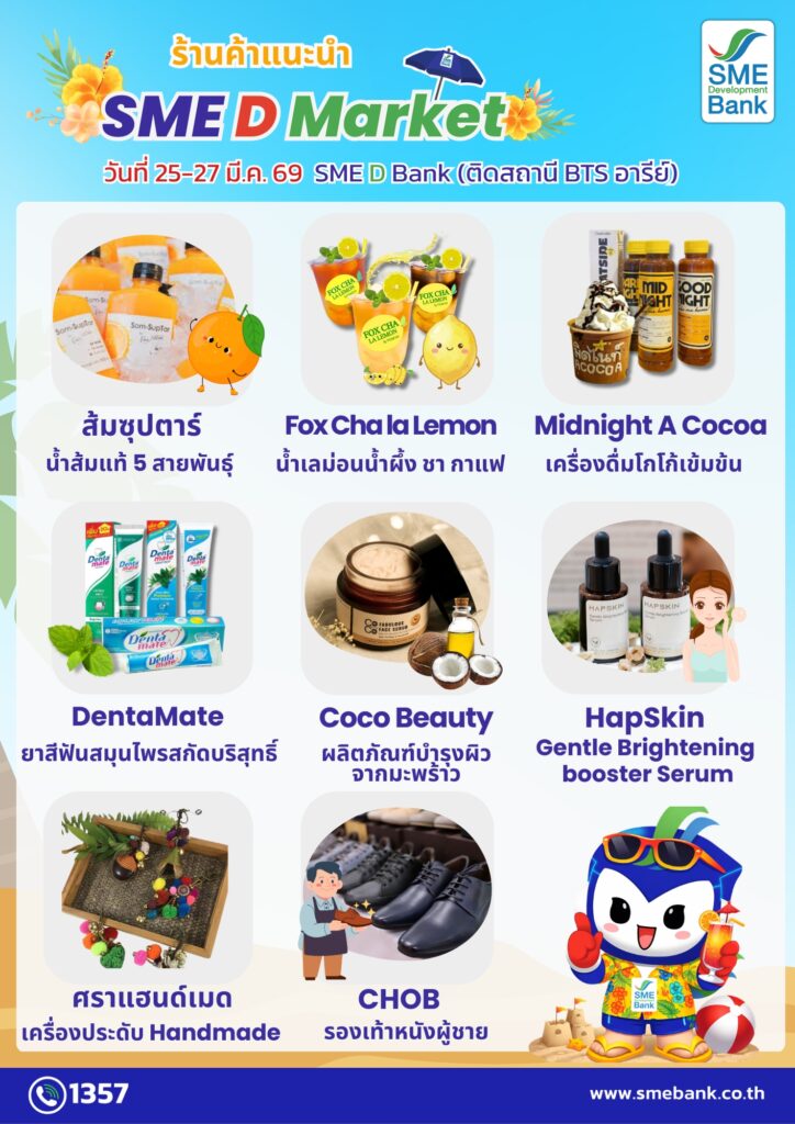 ธนาคารพัฒนาวิสาหกิจขนาดกลางและขนาดย่อมแห่งประเทศไทย (ธพว.) หรือ SME D Bank ขอเชิญชวนประชาชน ร่วมซื้อหาสินค้าดีจากผู้ประกอบการเอสเอ็มอีไทยทั่วประเทศ กระตุ้นเศรษฐกิจให้สุดคึกคัก ต้อนรับฤดูร้อนกับงาน “SME D Market” ประจำเดือนมีนาคม 2569 จัดระหว่างวันที่ 25-27 มีนาคม 2569 ณ หน้าอาคาร และชั้น 1 อาคาร SME Bank Tower (ติดรถไฟฟ้า BTS สถานีอารีย์) พบกับสินค้าอุปโภคบริโภค อาหาร เครื่องดื่ม และผลิตภัณฑ์คุณภาพหลากหลายประเภท ที่รวบรวมสินค้ามาไว้ครบในจุดเดียวมากกว่า 50 ร้านค้า