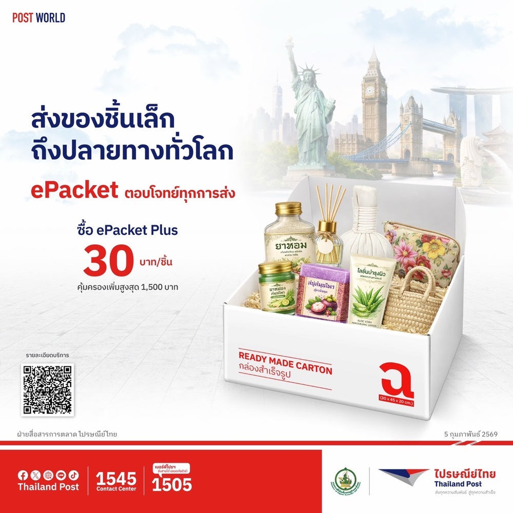 บริษัท ไปรษณีย์ไทย จำกัด เดินหน้ากลยุทธ์ขนส่งระหว่างประเทศ รับมือความท้าทายการค้าโลกยุคใหม่ที่มีการแข่งขันสูงและต้นทุนผันผวน ชู บริการขนส่งระหว่างประเทศ “Courier Post Plus และ “ePacket เป็นกลไกสนับสนุนผู้ประกอบการไทย โดยเฉพาะ SME และผู้ค้าออนไลน์ ให้เข้าถึงตลาดต่างประเทศได้สะดวกขึ้น ลดต้นทุนต่อชิ้น เพิ่มความเร็วในการจัดส่ง และเสริมขีดความสามารถในการแข่งขันของสินค้าไทยบนเวทีโลก