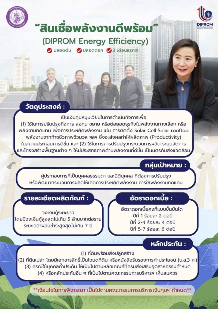 นางสาวณัฏฐิญา เนตยสุภา อธิบดีกรมส่งเสริมอุตสาหกรรม เปิดเผยว่า ขณะนี้ภาคธุรกิจกำลังเผชิญความท้าทายในโครงสร้างต้นทุนที่มีแนวโน้มสูงขึ้นจากวิกฤตพลังงานโลก โดยเฉพาะปัจจัยด้านราคาและข้อจำกัดด้านการขนส่งที่ปรับตัวเพิ่มขึ้น ซึ่งประเทศไทยเป็นหนึ่งในผู้นำเข้าพลังงาน ได้รับแรงกระแทกจากวิกฤตนี้โดยตรง ส่งผลให้ผู้ประกอบการ SMEs ต้องแบกรับภาระต้นทุนการผลิตที่เพิ่มขึ้น กระทบต่อการดำเนินธุรกิจ การบริหารสภาพคล่อง และมีผลต่อความสามารถในการแข่งขันที่อาจลดลงในระยะยาว ทั้งนี้ ดีพร้อมได้ประเมินว่าสถานการณ์ที่เกิดขึ้นไม่ใช่เพียงวิกฤตระยะสั้น แต่เป็นจุดเปลี่ยนสำคัญที่ภาคอุตสาหกรรมต้องเร่งปรับโครงสร้างด้านพลังงานอย่างเร่งด่วน ดังนั้น เพื่อให้สอดรับกับมติคณะรัฐมนตรีที่ต้องการให้ทุกภาคส่วนเร่งดำเนินการช่วยเหลือภาคธุรกิจและอุตสาหกรรมที่ได้รับผลกระทบจากวิกฤตดังกล่าว ดีพร้อม โดย เงินทุนหมุนเวียนเพื่อการส่งเสริมอาชีพอุตสาหกรรมในครอบครัวและหัตถกรรมไทย จึงพัฒนาผลิตภัณฑ์สินเชื่อใหม่ภายใต้ชื่อ “สินเชื่อพลังงานดีพร้อม (DIPROM Energy Efficiency)” เพื่อให้เป็นเครื่องมือทางการเงินที่ผู้ประกอบการสามารถเข้าถึงง่าย และช่วยบรรเทาผลกระทบโดยตรงต่อภาค SMEs ไทย