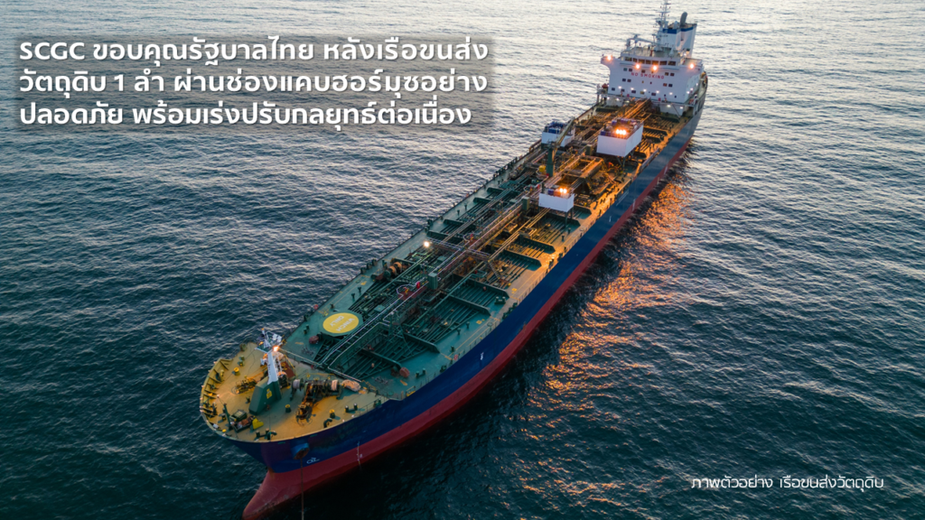 เอสซีจี เคมิคอลส์ หรือ SCGC โดยนายศักดิ์ชัย ปฏิภาณปรีชาวุฒิ ประธานเจ้าหน้าที่บริหารและกรรมการผู้จัดการใหญ่ เผยถึงสถานการณ์การจัดหาวัตถุดิบเพื่อผลิตเม็ดพลาสติก ล่าสุดเรือขนส่งวัตถุดิบ (แนฟทา) จำนวน 1 ลำ จากทั้งหมด 2 ลำ ซึ่งติดค้างอยู่บริเวณช่องแคบฮอร์มุซได้เดินทางออกมาอย่างปลอดภัยเป็นที่เรียบร้อยภายหลังจากการเจรจาของรัฐบาลไทย ซึ่งบริษัทฯ ขอขอบคุณกระทรวงการต่างประเทศ สถานทูตอิหร่านประจำประเทศไทย รัฐบาลสาธารณรัฐอิสลามอิหร่าน และรัฐสุลต่านโอมาน รวมทั้งภาคส่วนต่าง ๆ ที่เกี่ยวข้องเป็นอย่างสูงสำหรับความช่วยเหลือและการสนับสนุนอย่างดียิ่งในครั้งนี้ สำหรับเรือขนส่งวัตถุดิบลำที่ 2 นั้น ขณะนี้ บริษัทเดินเรือกำลังประเมินสถานการณ์ เนื่องจากในพื้นที่ยังมีความอ่อนไหว ทั้งนี้ หวังว่าช่องแคบฮอร์มุซจะสามารถเปิดได้อย่างต่อเนื่องในระยะยาว