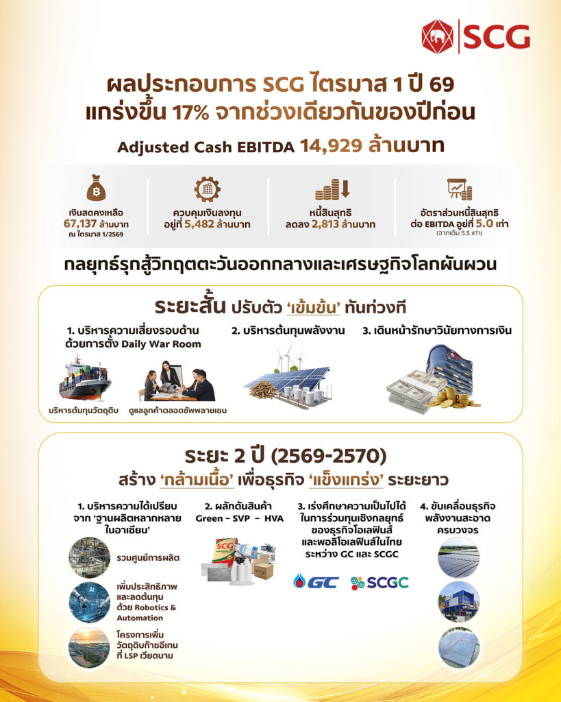 SCG Q1/69 ทำ Adjusted Cash EBITDA 14,929 ลบ. โต 17% ท่ามกลางเศรษฐกิจโลกผันผวน เร่งคุมต้นทุนผ่าน Daily War Room และวินัยการเงินเข้มข้น พร้อมแผน 2 ปี (69–70) เสริมแกร่งระยะยาว: ใช้ฐานผลิตอาเซียน–Robotics & Automation ดันโครงการ LSPE เวียดนาม เดินหน้าสินค้ากรีน–มูลค่าเพิ่ม ศึกษาร่วมทุนโอเลฟินส์–พอลิโอเลฟินส์ (GC–SCGC) และขยายพลังงานสะอาดครบวงจร